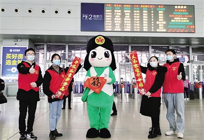 昨日是春运首日,“衡阳群众”青年志愿者联合衡阳铁路运输检察院志愿者在高铁衡阳东站开展“情满旅途 暖冬行动”志愿服务活动,30余名志愿者来到车站各处,为旅客提供搬运行李、指引咨询、帮扶老弱病残等志愿服务,并暖心送上姜汤和春联,让旅客感受到温馨幸福的年味。■本报记者 金明达 摄