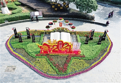 7日下午,在石鼓广场,记者看见景点中央红色卡通造型的“福牛”展板抢人眼球。展板的背面是一艘载满鲜花的帆船,寓意牛年新春一帆风顺;花卉景点的正前方用鲜花绣织而成的红色大雁振翅翱翔,象征牛年扭转乾坤,经济社会发展各项事业蒸蒸日上。