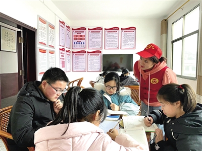 在长江镇柘塘村村委会,图书阅览室和妇女儿童活动室摇身一变,成了温馨舒适的学习场所,刘艳红和其他三位志愿者正在辅导孩子们做作业。只见孩子们三五个围坐一桌,低着头认真写作业。遇到难题时,志愿者便耐心地与孩子们共同探讨,帮助他们找到解题思路。八年级学生文晨瑾说:“ 我觉得很开心,也很有收获,在这里陪着其他同龄的同学们一起做作业,更有学习氛围,并且有志愿者哥哥、姐姐帮我们辅导作业。”