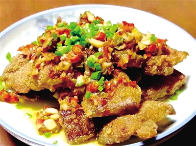 麸子肉是选用上好的五花肉,切成长10cm宽5cm厚5mm,加入料酒、十三香腌制2小时以上,再用粳米(糯米亦可)研磨成粉,将腌制好的肉逐块拍粉,然后取锅倒入植物油,将肉炸至酥黄备用。实际上已经可以吃了,还可以将炸好的麸子肉,取适量放入锅蒸,蒸至肉酥烂,食用起来口感更佳。