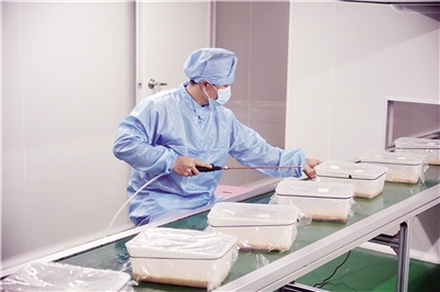走进宽敞明亮、干净整洁的生产车间,映入眼帘是“全副武装”的工作人员——穿着统一的蓝色工作服、佩戴口罩、戴着帽子,正有条不紊地在生产线上忙碌着。由于蛹虫草生长环境的特殊性,整套生产流程操作必须严格遵守无菌原则。龙新说,进入百级接种间前,需要规范穿戴工作衣帽,在风淋室进行全身消毒灭菌,“我们的百级接种间,无菌的等级相当于三甲医院的手术室。”