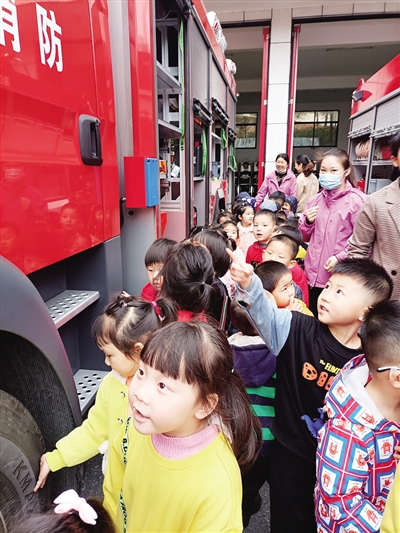 本报讯 “发现家里着火了要打电话给119找消防员叔叔……”3月17日,南岳区童心幼儿园组织小朋友到驻地消防队开展“普及消防知识 增强安全意织”主题实践教育活动。