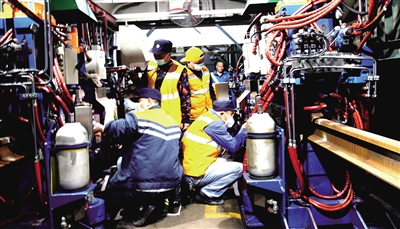 近日,广铁工务大修段组织精兵强将对全段所有施工机械设备进行健康“体检”,全面消除施工机械设备“小而广”隐患,为线路大修安全生产“强筋壮骨”。图为该段衡阳焊轨车间员工对焊轨机器设备进行精细“体检”时情景。 ■通讯员 陈志清 摄