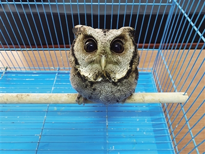在嫌疑人家中,一只颇具呆萌气质的小鸟被民警救下。这只小鸟有一双透亮灵活的大眼睛,尖尖的嘴巴、巴掌大的小脸,看着随时都好像在“生气”。经民警确认,该鸟为国家二级保护动物雕鸮(xiāo)。