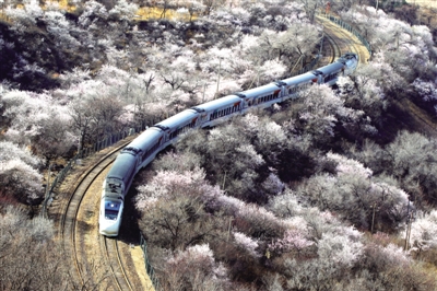 3月23日,北京市郊铁路S2线列车在花海中行进。春暖花开时节,在北京居庸关长城脚下,市郊铁路S2线列车穿行花海之中,美景如画。 ■新华社发