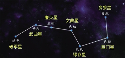 这七颗星都有响亮的中文名称,从斗口依次顺延为:天枢、天璇、天玑、天权、玉衡、开阳和摇光。前四颗星为斗身,又名斗魁,后三颗星为斗柄。