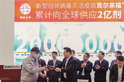 新冠疫苗克尔来福全球累计发货量达2亿剂。4月1日,在北京科兴中维生物技术有限公司举行的简短仪式上,商务物流部负责人(前右)将出库发运单交给发货负责人。 ■据新华社