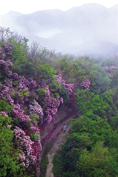4月5日,南岳衡山国家级自然保护区,野生鹿角杜鹃花开得格外引人注目,紫色如云的花儿一丛丛长在路边山坡上,把山林点缀得绚烂夺目。 ■罗 盟 摄