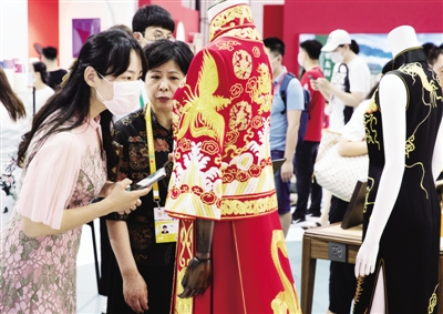 5月9日,在首届中国国际消费品博览会上,观众被制作精良的传统服装吸引。在首届中国国际消费品博览会上,众多融入潮流元素的国货分外亮眼,引人驻足。高品质、更时尚、更前沿的中国品牌焕发光彩,受到年轻消费者的青睐。■新华社 发