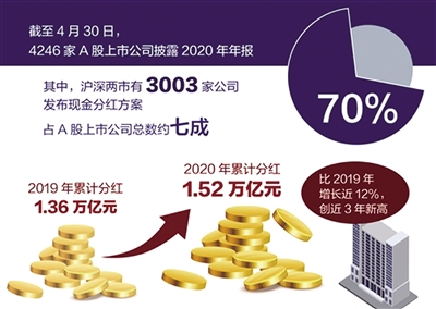 近期,A股上市公司亮出优异答卷,逾七成上市公司在2020年年报中表示将以现金分红方式回报股东。数据显示,截至4月30日,4246家A股上市公司披露2020年年报,营业收入合计53.07万亿元,实现归属母公司股东净利润合计3.98万亿元,同比分别增长2.45%、4.63%。其中,沪深两市有3003家公司发布现金分红方案,占A股上市公司总数约70%,累计分红总额1.52万亿元(含当年季报、半年报、年报分红),相比2019年度的1.36万亿元增长近12%,创近3年新高。