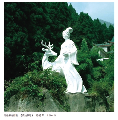 1988年,衡阳市建委组织在南岳半山亭“麻姑仙境”竹院召开“衡阳建设者评审工作会议”。半山幽谷、一泓清水,水中小岛上的《麻姑献寿》雕塑赏心悦目,抬眼山崖又看到《猴王偷桃》摩崖石刻,别具匠心,妙趣横生。前往磨镜台途中,一朵巨大的灵芝玉立山间,清泉流淌,自然和谐。这两处雕塑作品是元印先生的又一得意之作,为南岳半山亭的风光增色不少,后来成为游人慕名观摩的必选景点之一。
