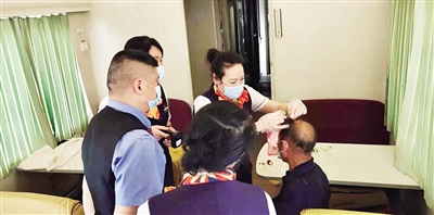 当日16时许,由长沙运段衡沪海车队十一组值乘的K512次列车运行至衡阳境内,乘务员周美蓉在巡视车厢时,发现2号车厢56号座位的旅客头部不断渗出鲜血且表情痛苦,便立即向列车长胡华斌汇报情况。胡华斌接到汇报后,立即赶到2号车厢查看旅客情况,并通知列车救护员马媛媛携应急医药箱赶往现场。