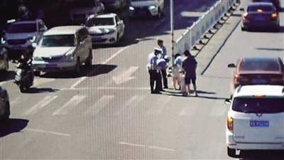 事情还要追溯到当天9时10分,民警正在执勤点执勤时,一对年轻的夫妇带着两名小朋友朝他们走来。“当时这对年轻的夫妇一人领着一个孩子走在斑马线上,其中一人手上提着一个塑料袋,我们以为他们只是日常过马路。”师古中队协警曹日红回忆说。她胸前佩戴的执法记录仪完整地记录下了事情的整个过程。