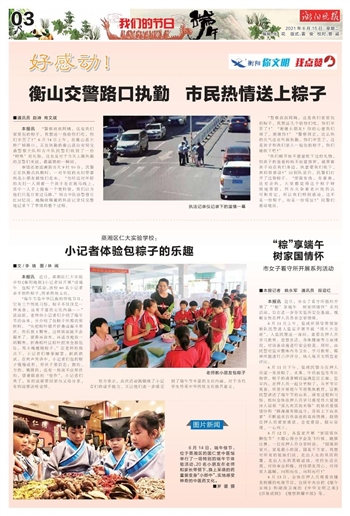 本报讯 “警察叔叔阿姨,这是我们家里包的粽子,我想送一些给你们吃,你们辛苦了!”6月14日上午,在衡山县大桥广场路口,正在执勤的衡山县公安局交通警察大队师古中队民警们收到了一份“特殊”的礼物,这也是对于当天上路执勤的交警们来说,最温情的一瞬间。