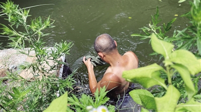 找准位置、屏住呼吸,唐志伟时而蹿入水道深处捞杂物、时而冒出头来换气,在凛冽与炎热中来回穿梭。不一会儿,堤岸旁已积满他从水道中带上来的“战利品”——水草、树枝、生活垃圾……