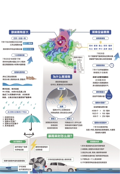 7月17日以来,河南出现持续性强降水天气,全省大部出现暴雨、大暴雨,强度达到“千年一遇”,强降水主要集中在西部、北部和中部地区,10地市出现特大暴雨。河南此次暴雨为何强度如此大?这次降雨是什么原因导致的?遭遇城市内涝如何避险?