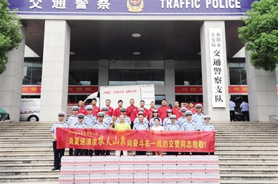 7月21日上午,“农夫山泉”衡阳总代理衡阳源林商贸有限公司负责人一行来到市公安局交警支队和基层一线大队,向战高温斗酷暑的一线执勤民辅警表达了敬意和慰问,并送来矿泉水590件、遮阳伞109把。■通讯员 肖婵媛 摄