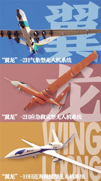 “翼龙”-10H近海救援型无人机,它可在空中远距离发现海上受困目标,可迅速确定受困人员、船只位置。它可持续提供大带宽的通信,还可携带应急救援空投浮舱,为后续救援开展争取宝贵时间……