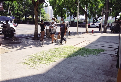 8月2日12时许,在先锋路小河街街口,记者发现街面上绿绿的一大片,凑近打量,原来是铺一地的长豆角,人行道成了私家晒场,这样既不卫生,又抹黑城市形象。 ■本报记者 胡亚华 摄