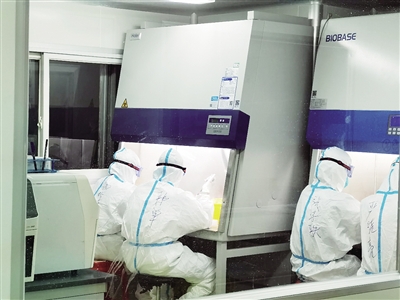 为了防止漏检,该科对发热门诊患者和红、黄码的就诊者实行“双采双检”,工作量相比平时更是增大数倍。“对检验医师而言,加样环节最有挑战。工作数小时下来,护目镜上全部是雾,根本无法看清。”彭咏麟告诉笔者,检验医师们没法用手擦拭护目镜上的雾珠,必须聚精会神,用尽全力盯住那不足0.5cm直径的试管口,做好标本加样。