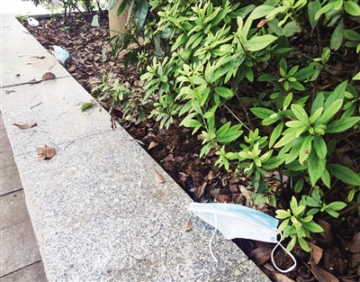 本报讯 公交站亭旁长5米的绿化带内 ,静躺着多少个口罩?近日湘江北路居民向本报新闻热线8611110报料,一些乘客下车时,将乘车时佩戴的口罩,随手一丢,扔弃在风光带的绿化带内,成了十分碍眼的垃圾。