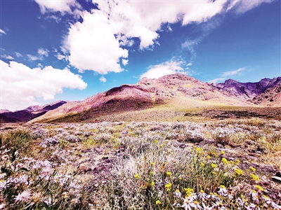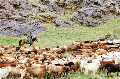 鄯善的天山牧场主要分布在七克台镇的天山南坡,夏牧场海拔在2700米至3400米之间,冬牧场海拔在1600米至2700米中低山带阿克萨拉,牧场总面积约361万亩。走进天山牧场,就走进了一片“风吹草低见牛羊”的宁静世界。抬眼层峦叠嶂,云淡天高,俯首牧草丰美,流水潺潺。牧民们赶着牛羊,马儿打着响鼻,世外桃源般的景象令人流连忘返。