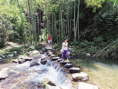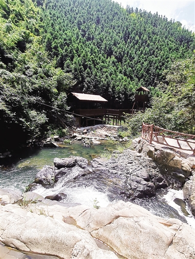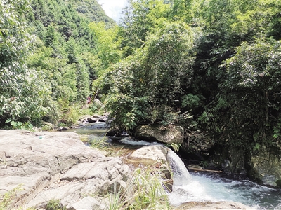 上游峡谷出口处还有一处奇景——千年红豆杉,该树位于东江村的山腰上,据传树龄在千年以上,树冠如盖,秋末结红豆,美丽如画,被称为“晴雨树”。