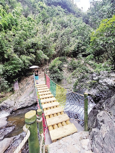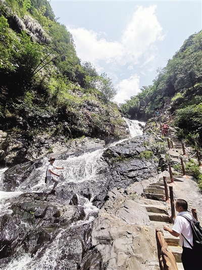 之所以叫东江大瀑布,因为它是这个峡谷里最大的瀑布。实际上它不是一个瀑布,而是大小相杂的一串瀑布,原本灰色的山石在水的滋润下显得墨黑,水流从黑色的巨石上层层跌落,似“大珠小珠落玉盘”,又像水墨画“七彩叠翠”,层层瀑布相叠。新建的游步道就从大瀑布的右侧石头上凿出一个个台阶,蜿蜒而上,靠近瀑布头的地方非常陡峭。现在修好了路,设置了安全栏杆,记者以前参加溯溪探险时,这里只有两根很粗的绳子可供攀援而上,通向峡谷深处……
