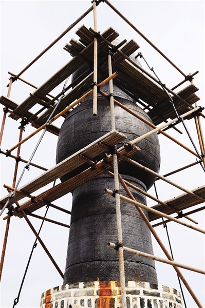 远远看去,被脚手架和网子“包裹”起来的珠晖塔,像一个整装待发的航天发射场。