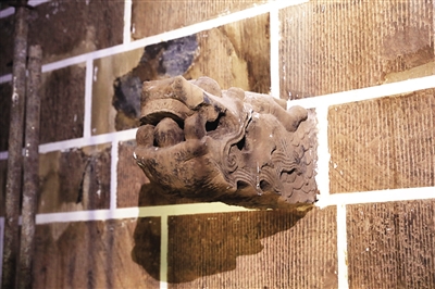 为了方便进行修缮工作,塔内部也搭满了脚手架。在施工方湖南省文保建设工程有限公司施工员周超的引导下,记者在一层塔室的神龛正上方,发现了一个口含龙珠的龙首石雕。