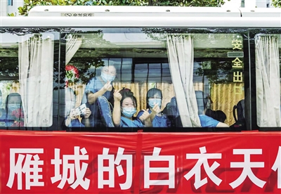 当天上午,在株洲市规划展览馆前坪,来自雁城200名医护工作者统一着装,手持鲜花,在热烈的掌声中与株洲市各级领导和市民挥手告别,民警们整齐列队,庄严敬礼,以最高礼遇欢送援株医疗队的白衣天使踏上归途。