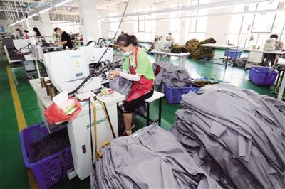 8月31日,常宁湘南纺织产业基地服饰生产园旭华服装有限公司生产车间内,工人们正有序分工,熟练操作,进行着裁剪、打线、压浪等工序。据了解,该公司已与国内上市服装品牌森马签约,全年订单排期全部排满。