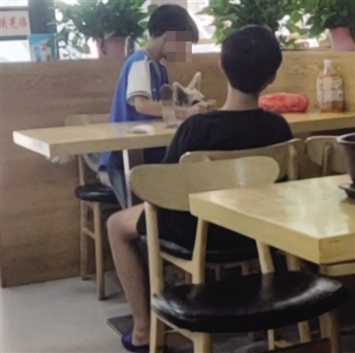 9月1日下午,在先锋路一餐厅内,两名男孩分别带一只宠物狗进入餐厅点餐,其中一名身穿蓝色T恤的男孩将宠物狗放在身旁的座椅上。两只宠物狗相互追逐打斗,给用餐的顾客带来惊扰。