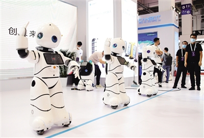 9月10日,2021世界机器人大会在北京开幕,本次大会的主题为“共享新成果,共注新动能”,包含论坛、博览会、机器人大赛等内容。当日,在2021世界机器人博览会现场,服务机器人在跳舞。■据新华社