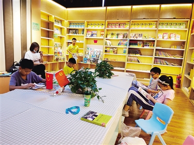 10月6日,雁峰区卷映书屋,学生、家长在选购阅读图书。国庆期间,许多家长和学生到书店充电学习,丰富假期生活。