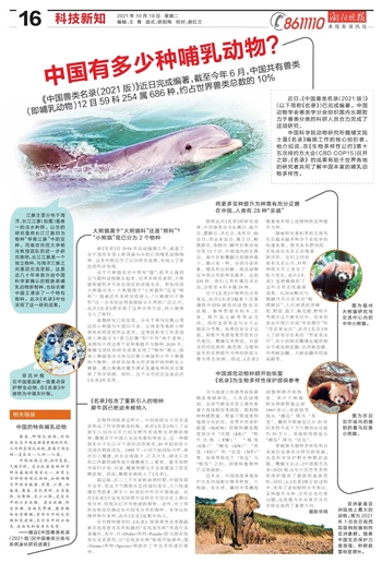 ~~~《中国兽类名录(2021版)》近日完成编著,截至今年6月,中国共有兽类(即哺乳动物)12目59科254属686种,约占世界兽类总数的10%