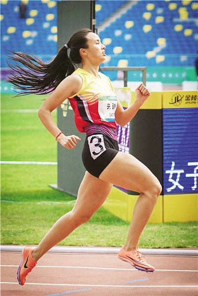 图为朱琳在残运会上以12.83秒的成绩夺得女子100米T13级决赛掠影。