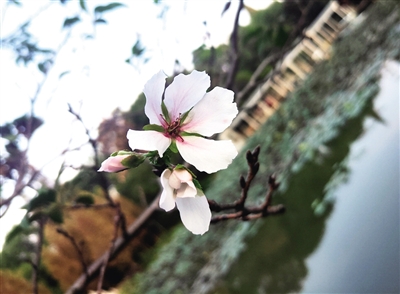 忽冷忽热的天气,让春花在秋日绽放了。23日下午,记者在西湖公园“西湖夜放白莲花”碑石旁发现,湖畔栽植的连排樱花树,原本光秃秃的枝桠上,居然发芽抽枝长叶,绽放出一朵朵白色的樱花。市园林绿化服务中心总工程师肖伟生介绍说,春花反季节开花,与今年夏天超长的高温酷热气候有关。最近一段时间,经历寒流阴雨湿寒之后,突然放晴回暖,天气忽冷忽热,很像春天的气候,春花抵挡不住外界的诱惑,误以为春季来临了,犯迷糊开花。除了樱花之外,海棠花、桃花等春花也会出现类似花开乱方寸的现象。