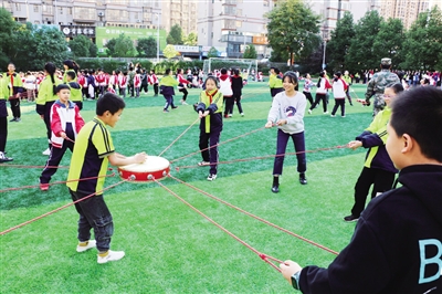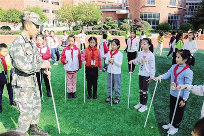 11月7日下午,蒸湘区大立实验小学171名衡阳晚报小记者参加军事拓展训练。图为小记者们分组体验拓展训练“鼓动人心”“不倒森林”。■通讯员 程 玲 摄