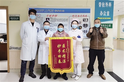 4月2日,56岁的刘阿姨将一面写着“医术精湛 妙手回春”的锦旗赠与科室,诉说着她满满的感激。“之前因为右下肢剧烈疼痛,不能正常行走和躺下,将近20天没有正常入睡,还好遇到了你们,解决了困扰我的难题。”刘阿姨说道。