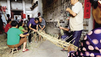 据了解,编织稻草龙是耒阳市部分乡镇的一项民间技艺,属耒阳市级非物质文化遗产代表性项目。每逢中秋时节,该市多地都有舞稻草龙祈福的习俗。而严村村中秋节“舞稻草龙”的习俗相传至今已有近400年历史,且从未间断。如今该村每年的“稻草龙”制作都是集中在村里上、中、下湾的正厅屋进行,稻草龙编扎仍保持着传统的手工技艺。