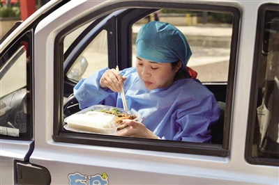 志愿者刘琳负责运送的是封控楼栋,身穿蓝色隔离服,眼疾手快的她在一堆物品中查找该楼栋的物资,和同伴们一起将物资搬上自己的小电动车后,开车一溜烟跑了一趟又一趟。“几乎一整天都在开车,都快人车合一了。”午饭时分,坐在车上吃饭的刘琳打趣地说。简简单单吃几口,她又将开始新的一趟“逆行”。