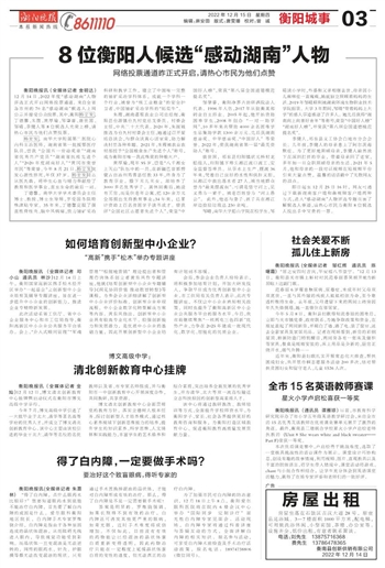 衡阳晚报讯 (全媒体记者 金明达)12月14日,2022年度“感动湖南”人物评选正式开启网络投票通道。来自全省各市州的70名“感动湖南”候选人上网公示并接受公众投票。其中,衡阳杨宏发、丁德馨、朱霞、黄厚瑜、邹肇睿、唐世国、邹晴、李健人等8位候选人光荣上榜,请热心市民为他们点赞投票。