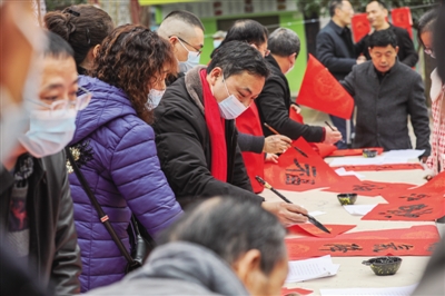 2023年春节即将到来,衡阳县书法志愿者进入村庄、走上街头,免费书写春联、“福”字赠送给市民,给市民送去新春的祝福。