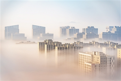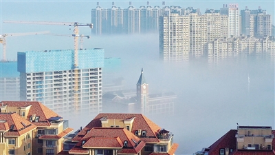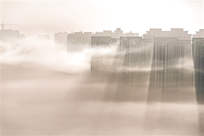 晨雾飘渺中的建筑。■张芝伟 摄