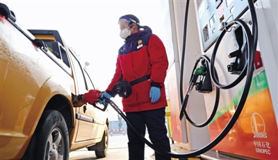 1月17日,在江苏连云港市海州区一处加油站,工作人员为汽车加油。国家发展改革委17日称,根据近期国际市场油价变化情况,按照现行成品油价格形成机制,自2023年1月17日24时起,国内汽油、柴油价格每吨分别降低205元和195元。■新华社发