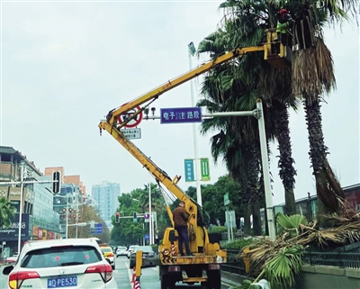 2月17日下午,记者在湘江南路看到,绿化养护人员站在高空作业车作业斗内对解放路观景台绿化带老人葵枯叶进行修剪,并动用高空作业车、货车及油锯等设备,对湘江两岸的高大乔木进行了“美颜瘦身”,对枯干的树木进行全面清理,以免枯树倒伏砸车伤人。