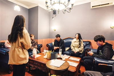 “然而这样还远远不够。”在当今这个互联网时代,王汛深知流量和玩家的重要性,便利用微信构建庞大的流量池。目前店里已有上千位高黏性玩家,每天活跃在剧本群里,每年暑假旺季的时候,店里每天至少有十几场剧本故事上演。“想要玩家有好的体验感,保证剧本的质量与玩家的匹配度很关键。”因此在剧本选择方面,王汛格外仔细,会定时前往大城市参加剧本杀展会,学习交流经验,不断筛选好的剧本,并将购买回来的剧本进行适当的修改调整与反复演练、测试,最终才会呈现到玩家面前。“近期我们排场比较多的是一些立意深刻的家国情怀剧本,比如说《九州四海》《苍岐》……”王汛如数家珍地向记者介绍这些“宝贝”。“此外我们也会根据玩家的年龄、职业、爱好以及难易程度来推荐合适他们的剧本。”