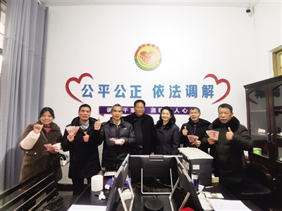 衡阳晚报讯 (文/图 通讯员 邓志红) “讨了好几年的工资,今天终于拿到手,太感谢你们了!”5位农民工满脸笑容,齐齐为衡东县人民法院干警点赞。近日,衡东县人民法院新塘法庭成功调解5件追索劳动报酬案件,为5名农民工拿回4.5万余元工资。