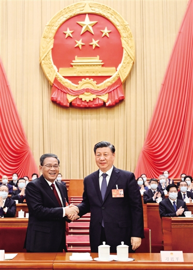 3月11日,十四届全国人大一次会议在北京人民大会堂举行第四次全体会议,根据国家主席习近平的提名,经过投票表决,决定李强为中华人民共和国国务院总理。这是习近平同李强握手。■新华社发